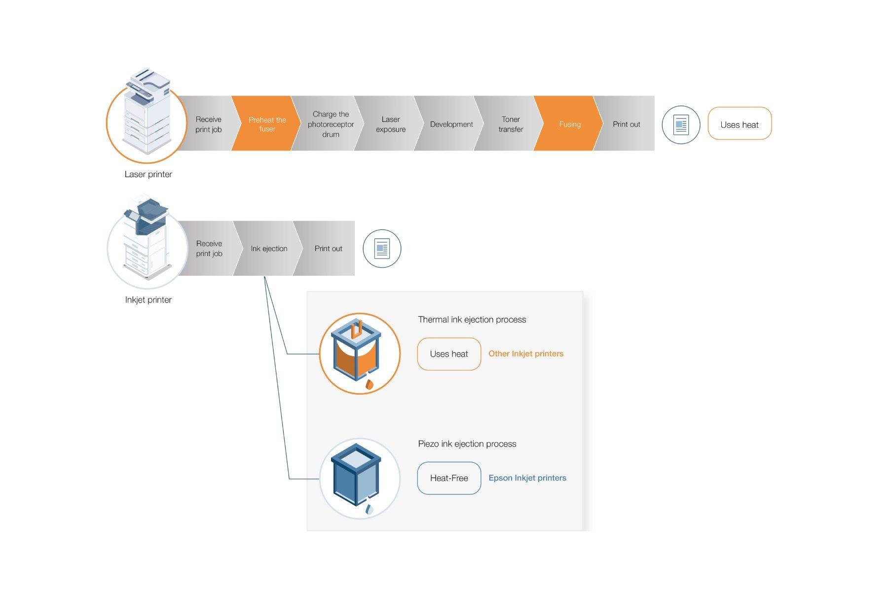 Laser printers typically have more consumables and require periodic replacement of the drum, transfer belt and fuse in many cases. Thanks to Heat-Free Technology, our inkjet printers use fewer parts that need replacing.